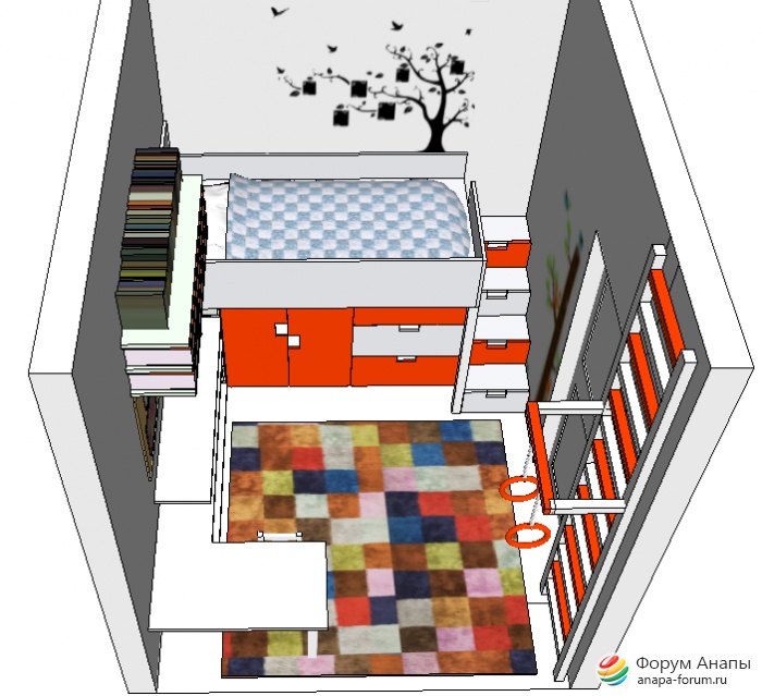 Детская на 6 кв.метрах, с высотой кровати 1 метр, под которой шкаф и куча ящичков для хранения. Идея  с сайта идеи для ремонта, хорошо придумали, ни один сантиметр площади не пропал, но много острых углов...